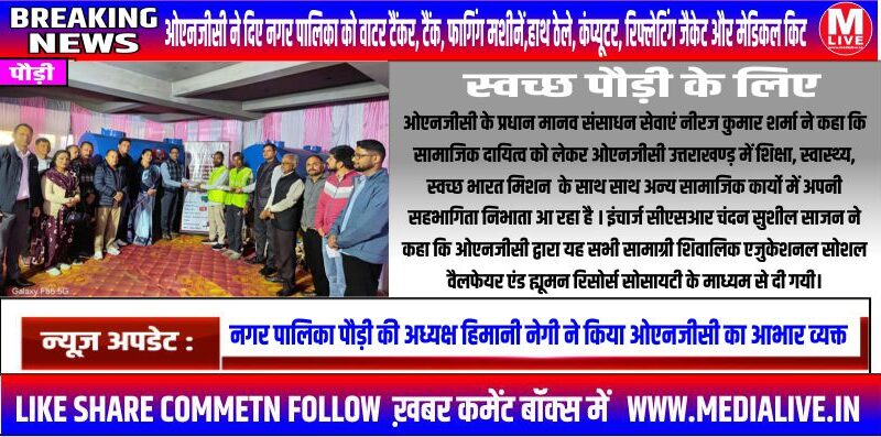 मीडिया लाइव, पौड़ी : मंडल मुख्यालय पौड़ी नगर पालिका को शहर की स्वच्छता के लिए ओएनजीसी ने वाटर टैंकर, टैंक,