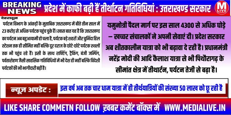 मीडिया लाइव, देहरादून : उत्तराखण्ड में पर्यटन- तीर्थाटन को बढ़ावा देने राज्य सरकार के प्रयास रंग लाने लगे हैं, ऐसा