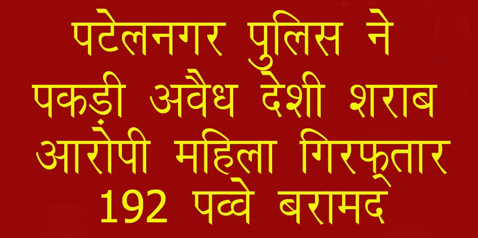 पटेल नगर पुलिस की तरफ से मिली जानकारी के मुताबिक रविवार चेकिंग के दौरान आरोपी महिला उषा देवी पत्नी महेंद्र निवासी ट्यूबवेल नम्बर चार पटेलनगर को अवैध शराब के 192 पव्वों के साथ पडा गया. आरोपी के खिलाफ आबकारी अधिनियम की धारा 60 के तहत मुकदमा दर्ज किया गया है. जारी बयान में अभियुक्त के विरुद्ध पहले भी गुंडा एक्ट की कार्रवाई की जा चुकी है. इसे अलावा कई अन्य मामलों में आरोपी के विरुद्ध मुकदमें दर्ज हैं. वहीँ न्यायालय अभियुक्त के खिलाफ कई बार गर जमानती वारंट जारी कर चुका है. इनकी भी तामील की गई है. सोमवार को आरोपी को कोर्ट में पेश किया गया.