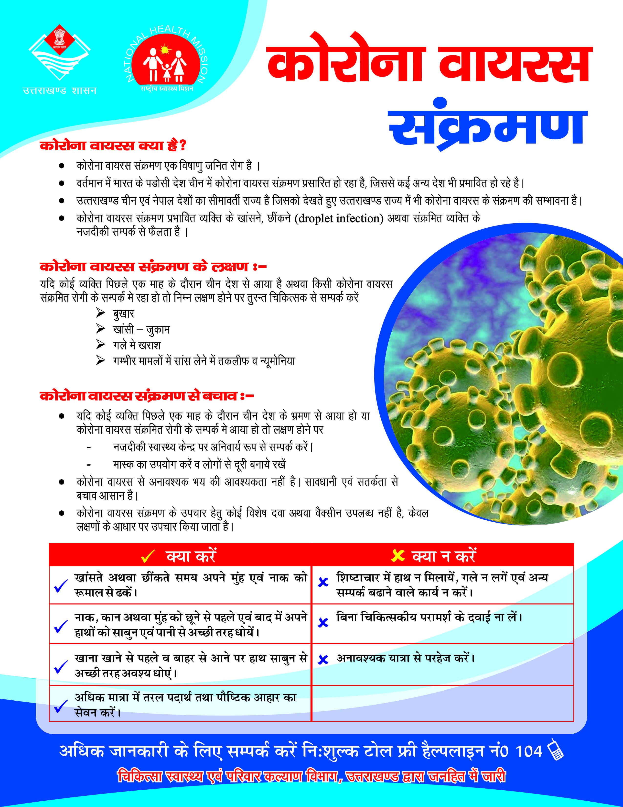 जिलाधिकारी ने कहा कि जल्दी ही एक कन्ट्रोल रूम स्थापित कर नोडल अधिकारियों की तैनाती की जायेगी। उन्होंने कहा कि कोरोना वायरस से अनावश्यक भय की आवश्यकता नहीं है सावधानी एवं सर्तकता से ही इससे बचा जा सकता है। मुख्य चिकित्साधिकारी डा. सविता हयांकी ने बताया कि यदि कोई व्यक्ति पिछले माह चीन या अन्य देशों से भ्रमण कर आया हो व संक्रमित रोगी के सम्पर्क में आया हो तो लक्षण होने पर स्वास्थ्य केन्द्र में अवश्य सम्पर्क करें। उन्होंने बताया कि इस वायरस सामान्य लक्षणों में बुखार, खाॅसी जुकाम, गले में खराश व गम्भीर मामलो में सांस लेने में तकलीफ व निमोनिया है।