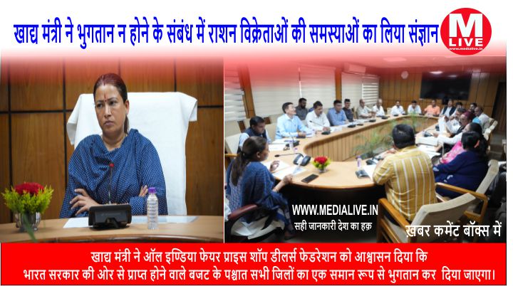 मीडिया लाइव, देहरादून : प्रदेश की खाद्य मंत्री रेखा आर्या ने विधानसभा स्थित सभागार कक्ष में राशन डीलर्स के भुगतान एवं अन्य समस्याओं के सम्बन्ध में खाद्य नागरिक आपूूर्ति एवं उपभोक्ता मामले विभाग के अधिकारियों के साथ बैठक की जिसमें ऑल इण्डिया फेयर प्राइस शॉप डीलर्स फेडरेशन, उत्तराखण्ड के पदाधिकारी उपस्थित रहे।