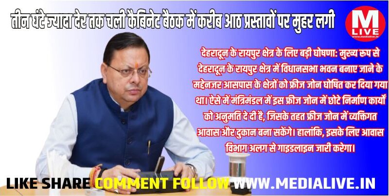 मीडिया लाइव, देहरादून : देहरादून: मुख्यमंत्री पुष्कर सिंह धामी की अध्यक्षता में आज सोमवार 13 अक्टूबर सुबह 10.45 बजे से सचिवालय में मंत्रिमंडल की बैठक हुई. तीन घंटे ज्यादा देर तक चली कैबिनेट बैठक में करीब आठ प्रस्तावों पर मुहर लगी।