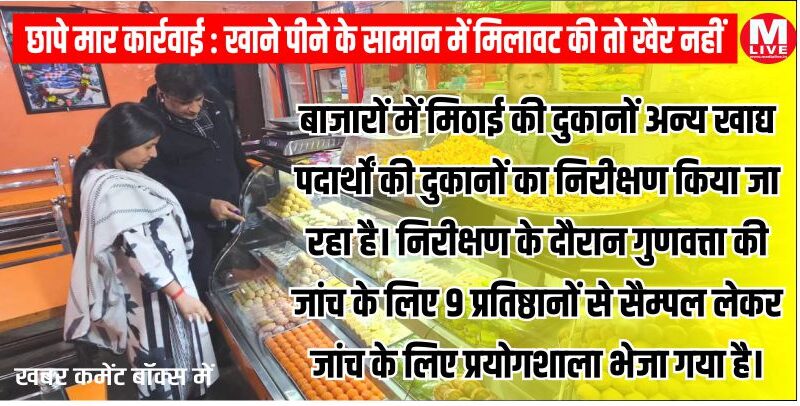 मीडिया लाइव , चमोली : त्योहारों के सीजन को देखते हुए खाद्य संरक्षा विभाग की ओर से बाजारों का सघन निरीक्षण किया जा रहा है। विभाग की ओर से बाजारों में खाद्य सामग्री की गुणवत्ता की जांच की जा रही है। विभाग की ओर से जनपद के बाजारों में निरीक्षण कर अभी तक 9 प्रतिष्ठानों से 9 खाद्य सामग्री के सैंपल जांच के लिए भेजे गए हैं।