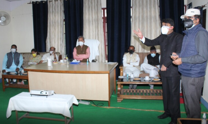 जिलाधिकारी नितिन सिंह भदौरिया ने जनपद में करोना संक्रमण की रोकथाम एवं आवश्यक तैयारियों की पाॅवर पाइंट प्रेजेंटशन के माध्यम से मुख्यमंत्री के सम्मुख रखी। इस दौरान प्राचार्य मेडिकल कालेज आर.जी. नौटियाल ने भी मेडिकल कालेज के कार्यों की प्रगति व समस्याओं के बारे में मुख्यमंत्री को अवगत कराया जिस पर उन्होंने शीघ्र समाधान करने का आश्वासन दिया। इस दौरान विधानसभा उपाध्यक्ष रघुनाथ सिंह चैहान, सांसद अजय टम्टा, विधायक महेश नेगी, विधायक महेश जीना ने कई समस्यायें सम्बन्धित क्षेत्र से मुख्यमंत्री के सम्मुख रखी जिस पर उन्होंने उचित कार्यवाही का आश्वासन दिया।