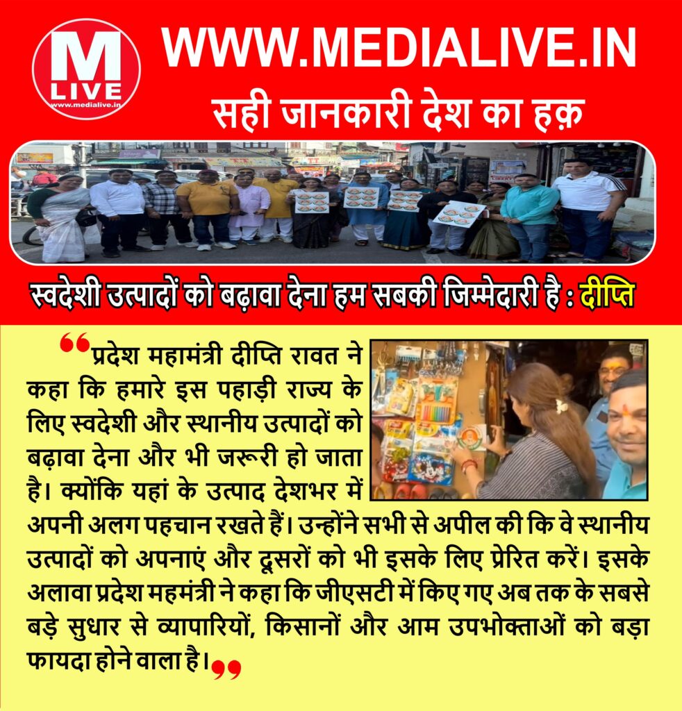 प्रदेश महामंत्री ने कहा कि हमारे इस पहाड़ी राज्य के लिए स्वदेशी और स्थानीय उत्पादों को बढ़ावा देना और भी जरूरी हो जाता है। क्योंकि यहां के स्थानीय उत्पाद देशभर में अपनी अलग पहचान रखते हैं। उन्होंने सभी से अपील की कि वे स्थानीय उत्पादों को अपनाएं और दूसरों को भी इसके लिए प्रेरित करें। उन्होंने कहा कहा कि जीएसटी में कए गए अब तक के सबसे बड़े सुधार से व्यापारियों, किसानों और आम उपभोक्ताओं को बड़ा फायदा होने वाला है।