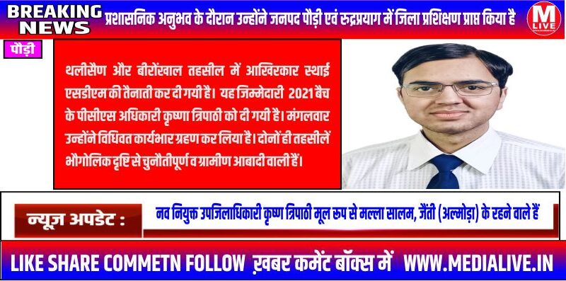 मीडिया लाइव, पौड़ी : थलीसैण और बीरोंखाल तहसील में आखिरकार स्थाई एसडीएम की तैनाती कर दी गयी है। यह जिम्मेदारी 2021 बैच के पीसीएस अधिकारी कृष्णा त्रिपाठी को दी गयी है। मंगलवार उन्होंने विधिवत कार्यभार ग्रहण कर लिया है। दोनों ही तहसीलें भौगोलिक दृष्टि से चुनौतीपूर्ण व ग्रामीण आबादी वाली हैं।