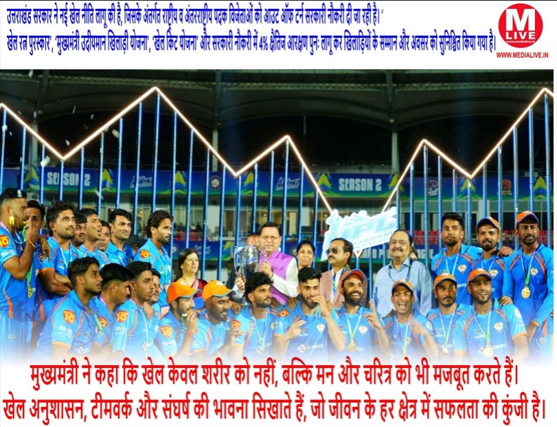 मीडिया लाइव, देहरादून : मुख्यमंत्री पुष्कर सिंह धामी ने रविवार शाम को राजीव गांधी अंतर्राष्ट्रीय स्टेडियम, रायपुर देहरादून में आयोजित उत्तराखण्ड प्रीमियर लीग 2025 के समापन समारोह में प्रतिभाग किया। सीएम ने सभी खिलाड़ियों और आयोजन समिति के पदाधिकारियों का स्वागत करते हुए विजेता टीम को उत्कृष्ट प्रदर्शन के लिए हार्दिक बधाई दी।